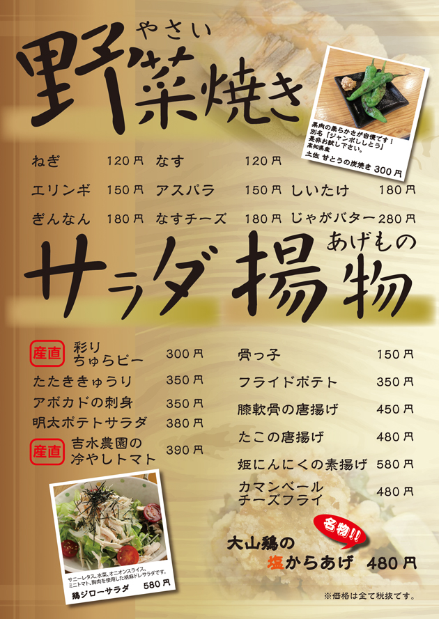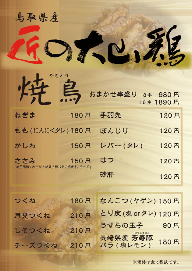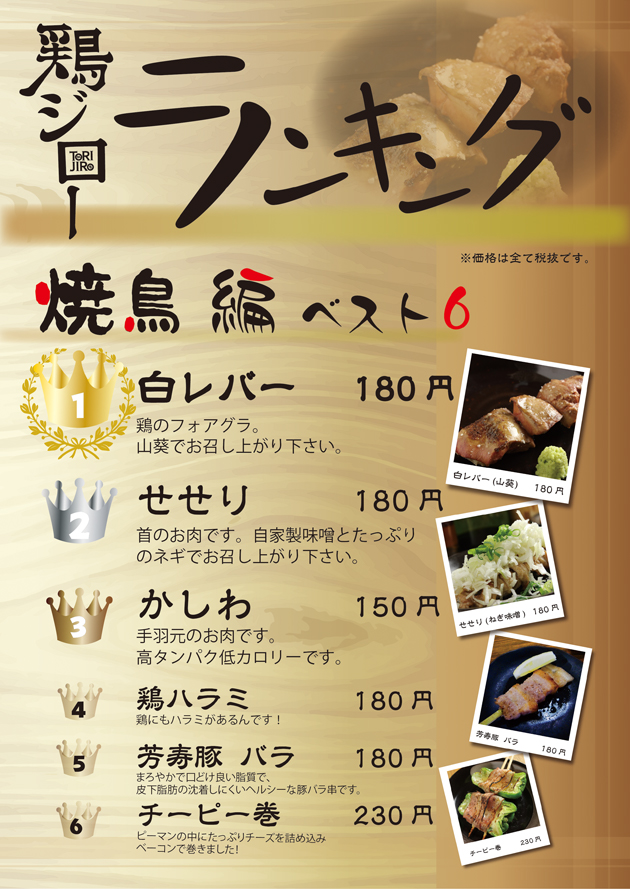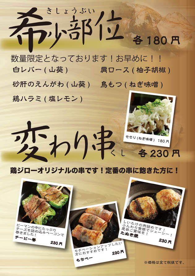鶏ジローの美味しい串焼きメニューや一品料理!※店舗により価格が異なります。